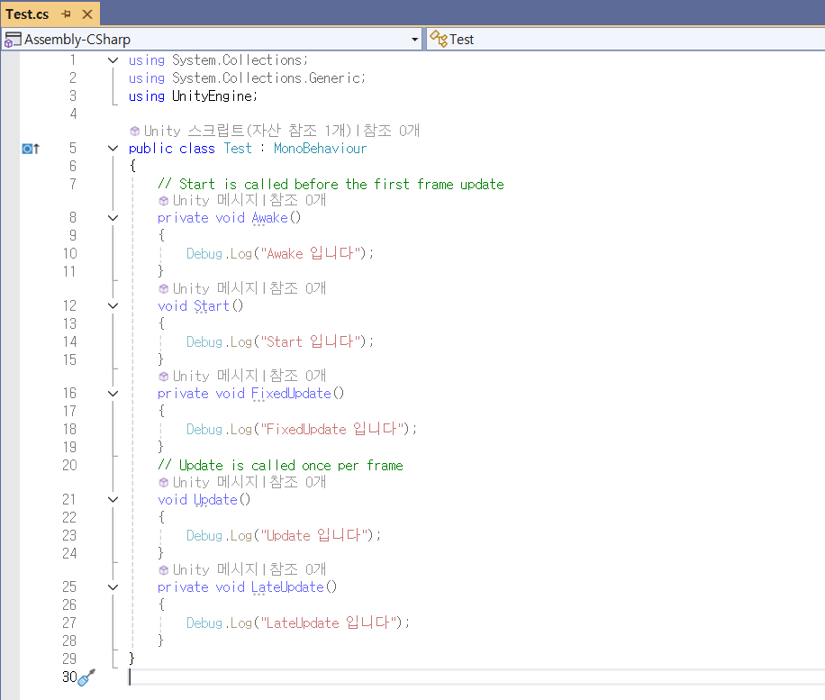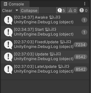 - 반복 실행 : Update, LateUpdate, FixedUpdate, OnTriggerXXX, OnCollisionXXX