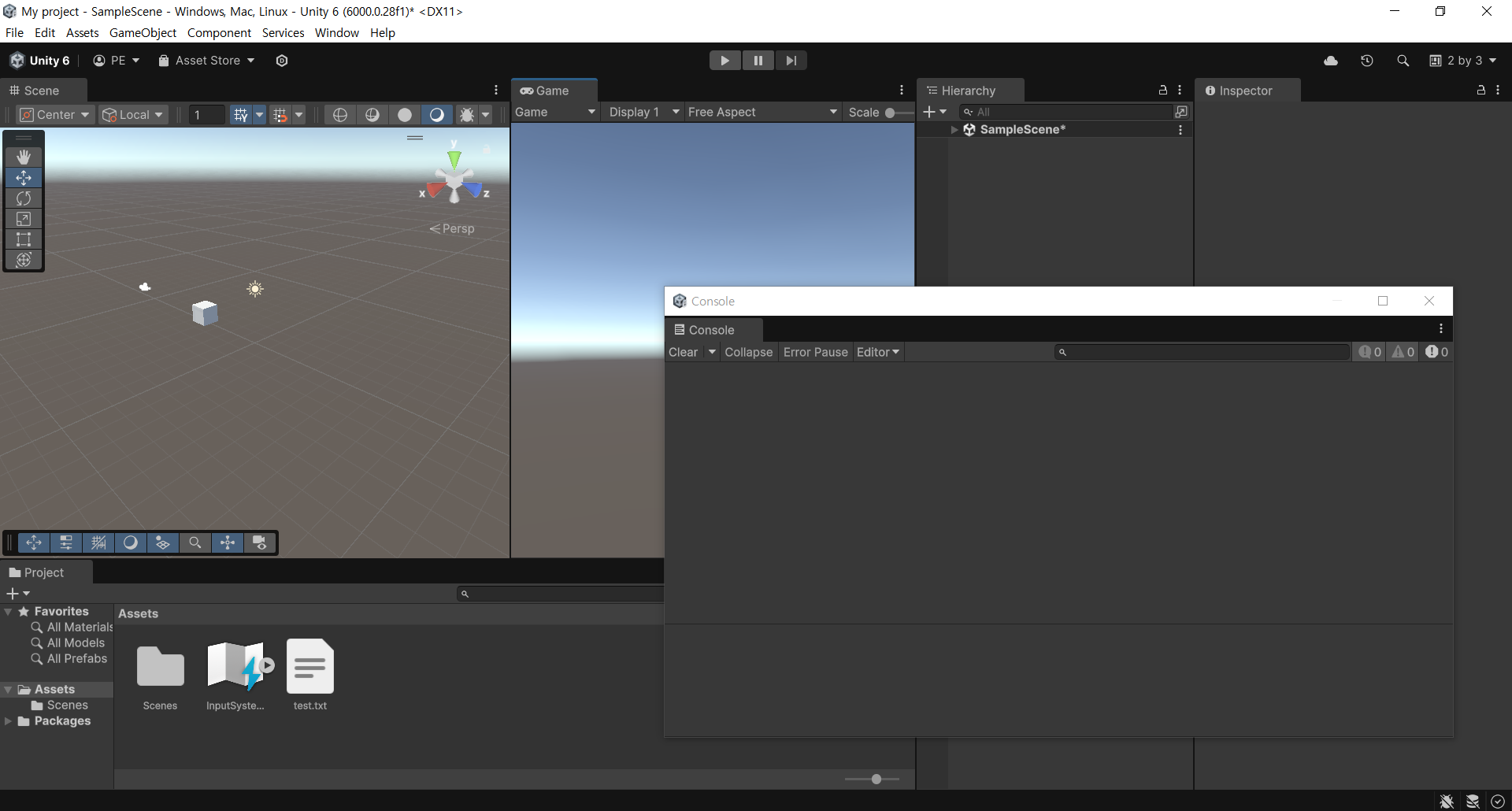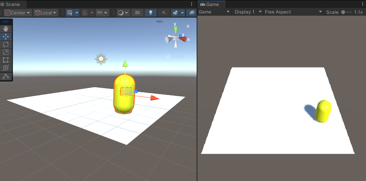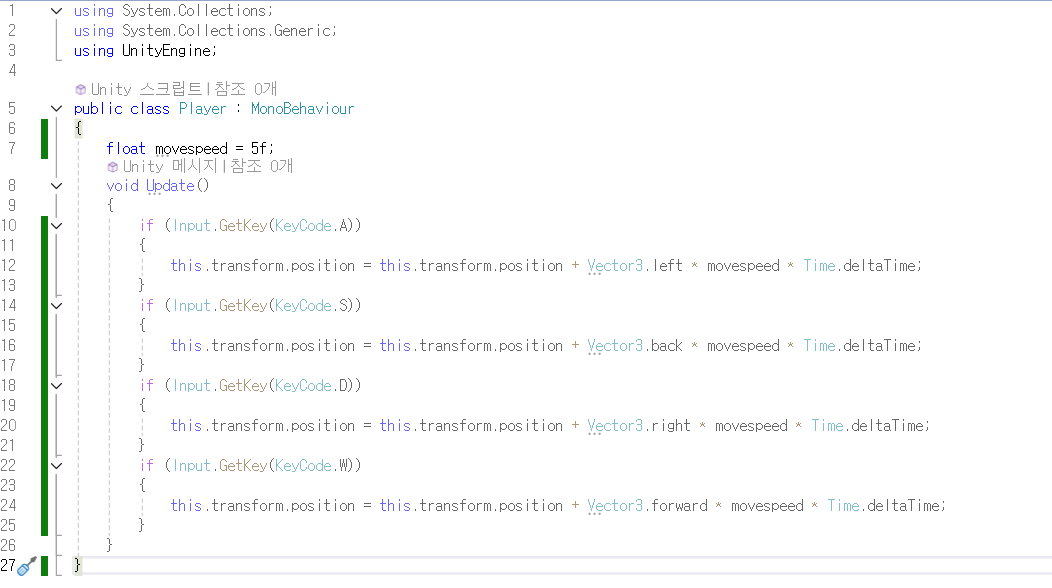 Player 스크립트를 컴포넌트에 넣고 실행시키면 다음과 같이 WASD로 움직이는 것을 볼 수 있다.