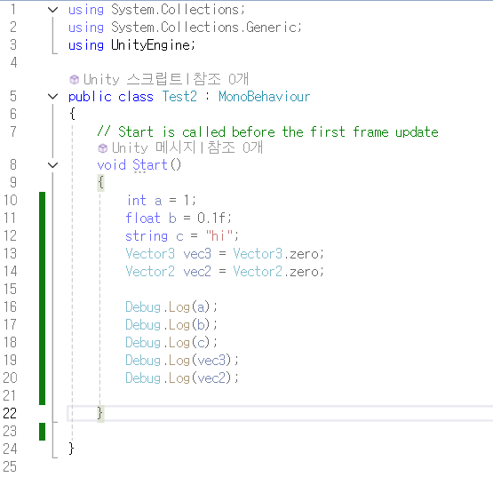 - Vector2 : 2가지 실수를 x,y로 표현. 주로 2D좌표를 나타날때 사용(ex: Vector3(0.1f, 0.2f))