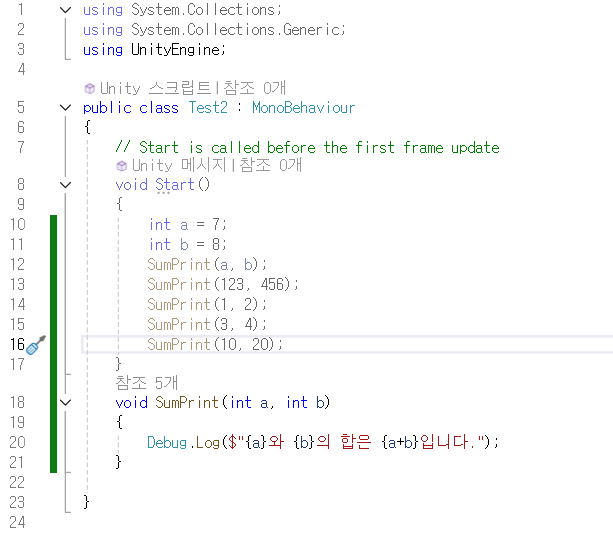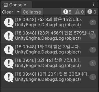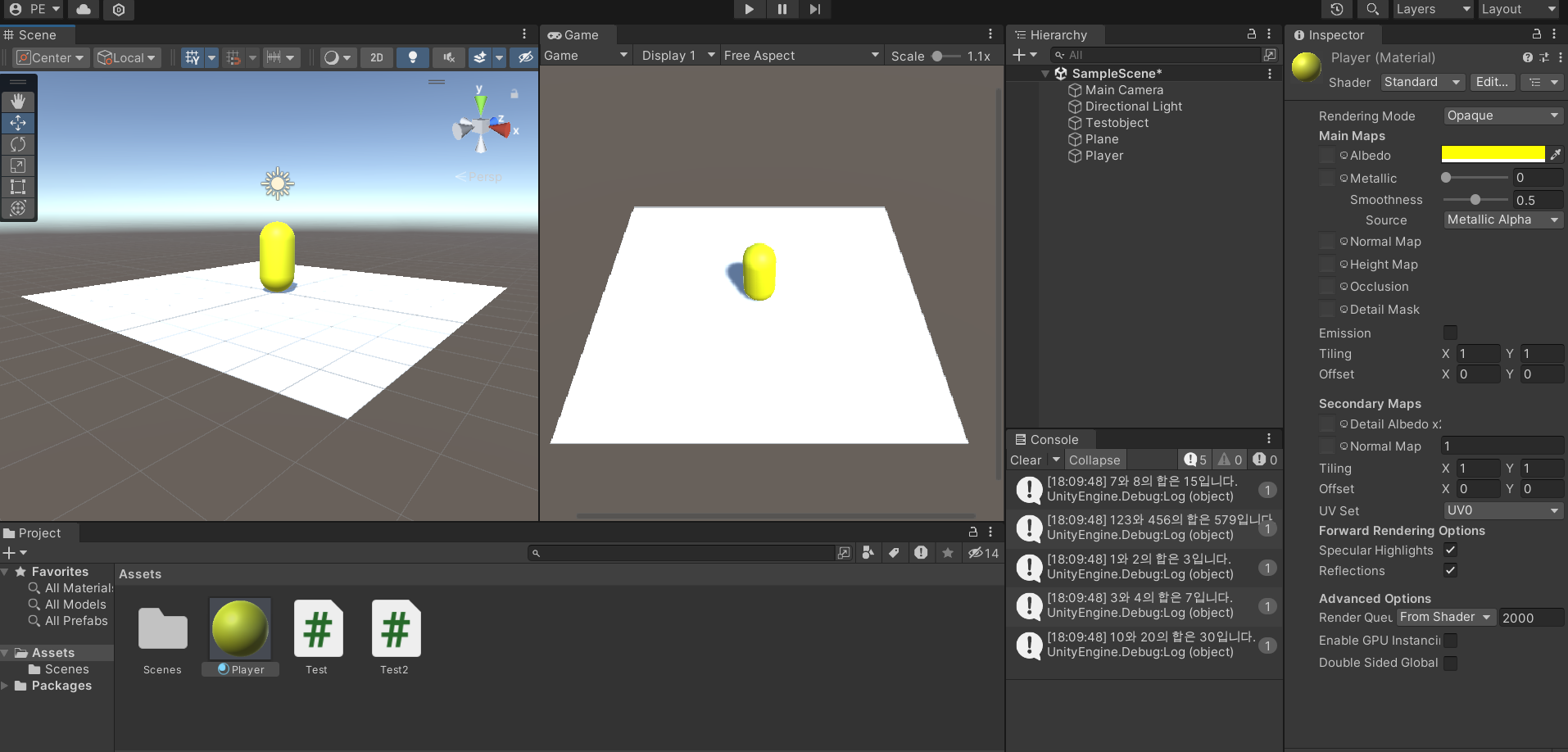 아래와 같이 Test2 C#script를 만들고, CreateEmpty의 component에 넣고 실행시키면 다음 결과가 나온다.